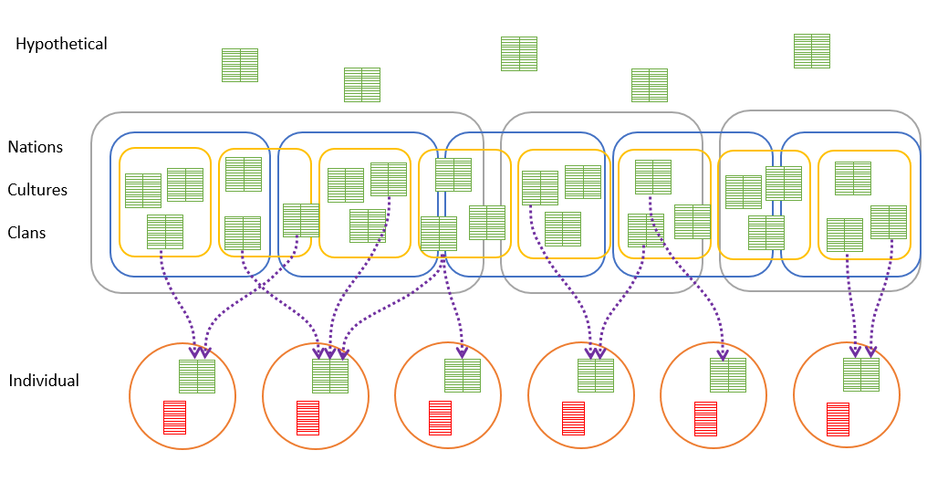 On the top there are hypothetical rules sets which we might speak of but which are not necessarily held by any given individual, and not necessarily impressed by any given nation, culture, or clan, but that can be seen as existing as well.