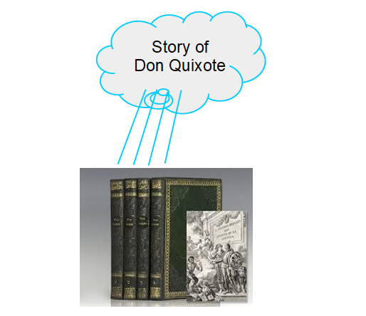 A book is a concrete object made of paper. On the paper is patterns of ink that form words and sentences. Consider the story of “Don Quixote.” There are many copies of the book, but it is generally considered that there is only one novel named Don Quixote by Cervantes. This is the conundrum: how does the single novel get attached to each copy of the book?