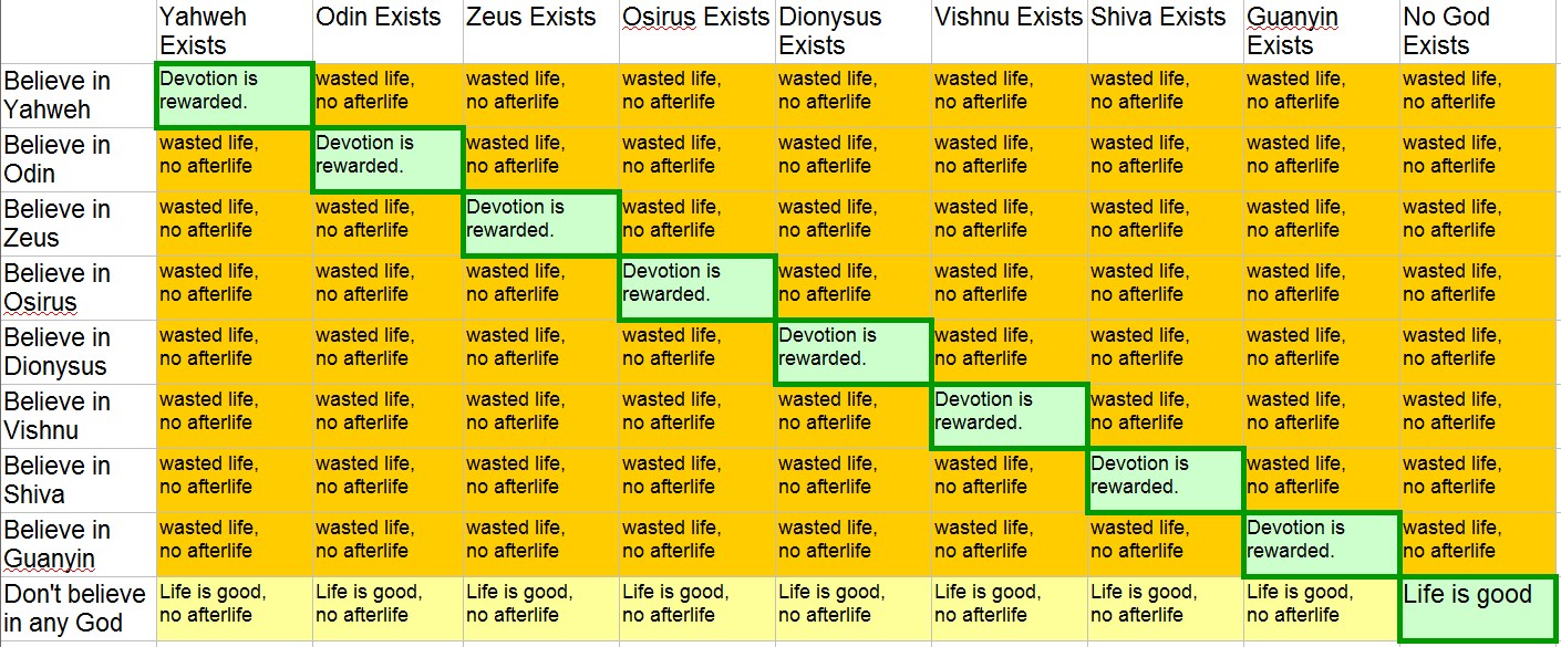 The advantage of the don't believe in god is that no matter what god exists, you never waste your life. Of course you might miss out on heaven, but getting the right god is exceedingly rare: a 1:4000 chance.